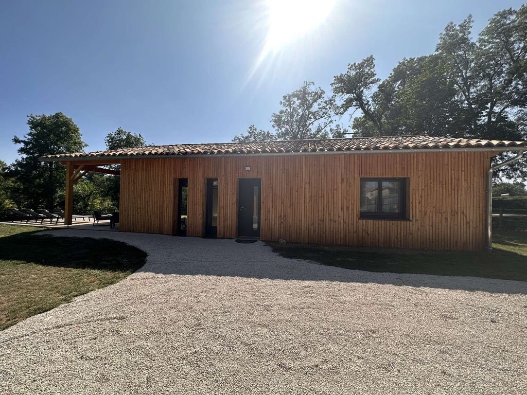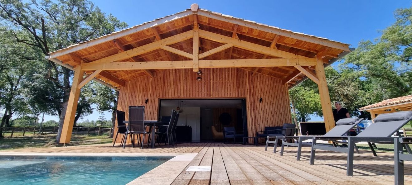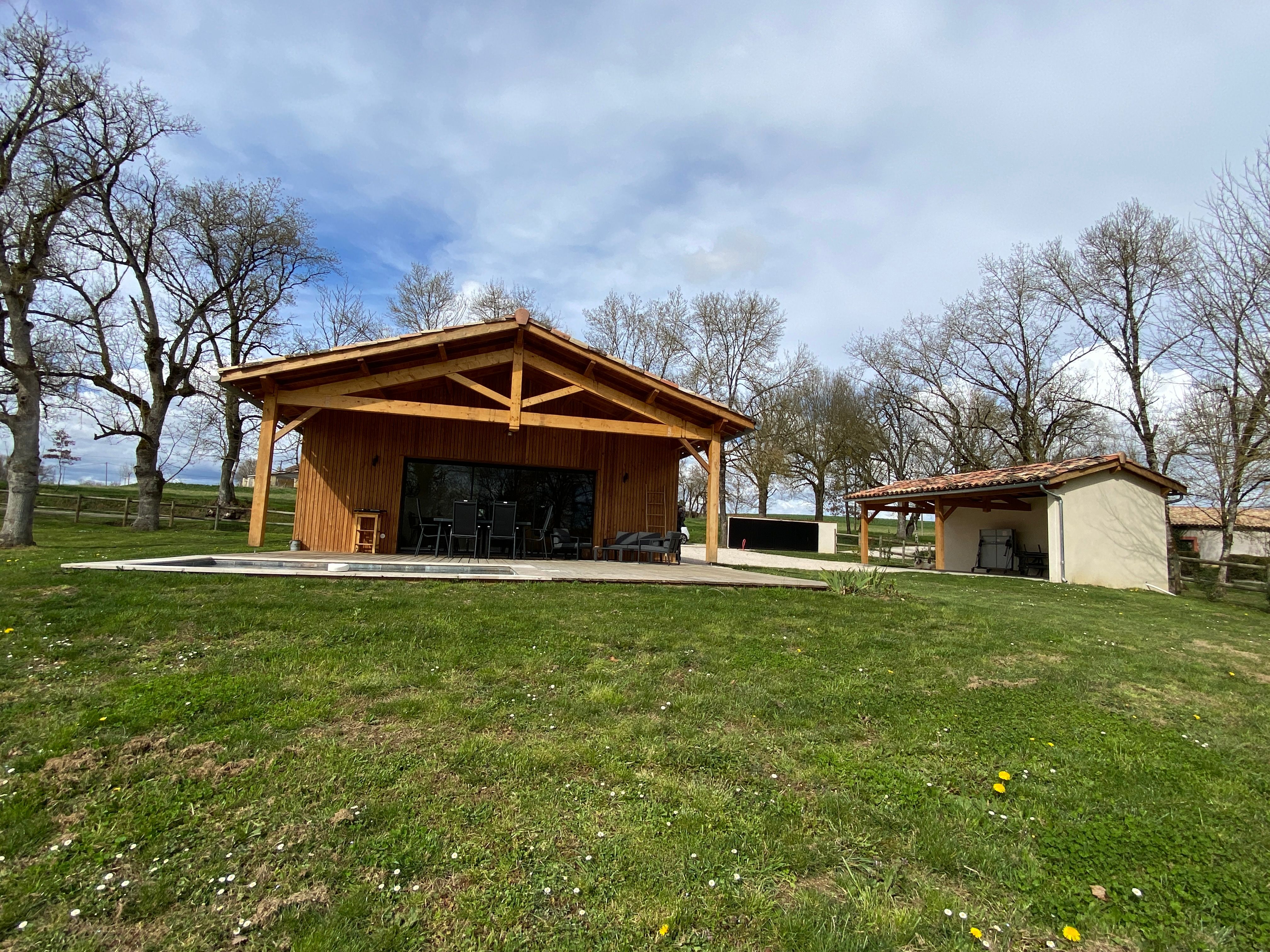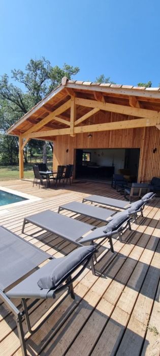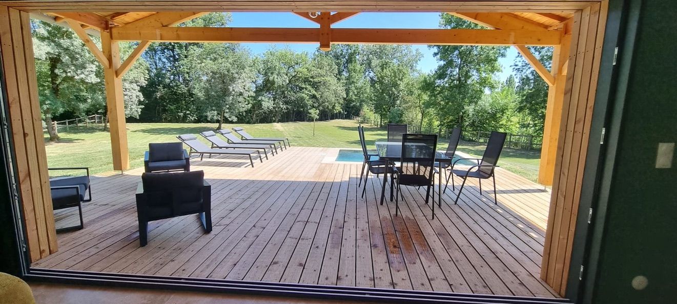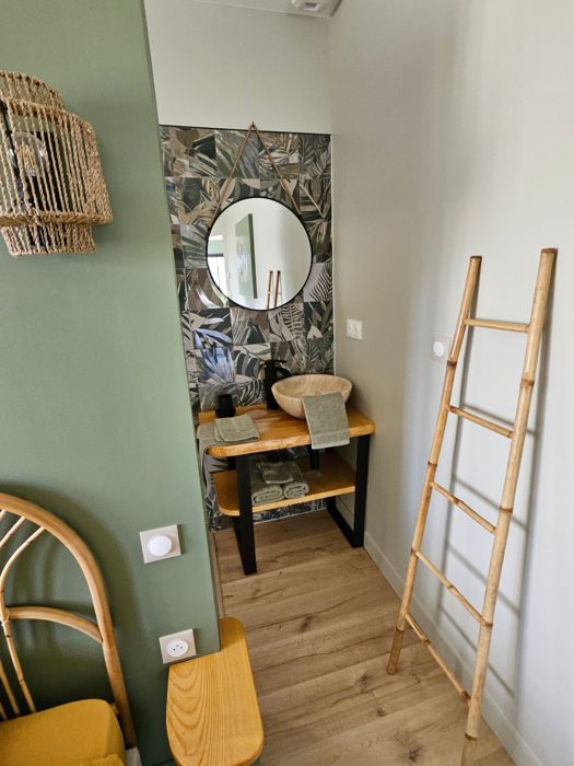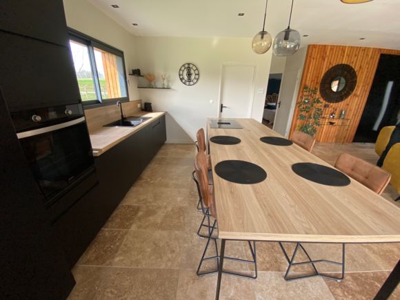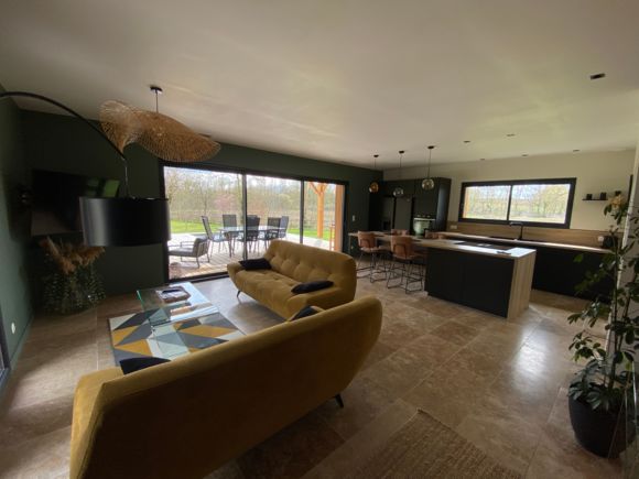 A few meters from a small stream winding the countryside « Candé », then distanced by a pretty wooded meadow, discover this wooden house, with clean lines, revealing by its large bay with galandage an interior all in charm and elegance.