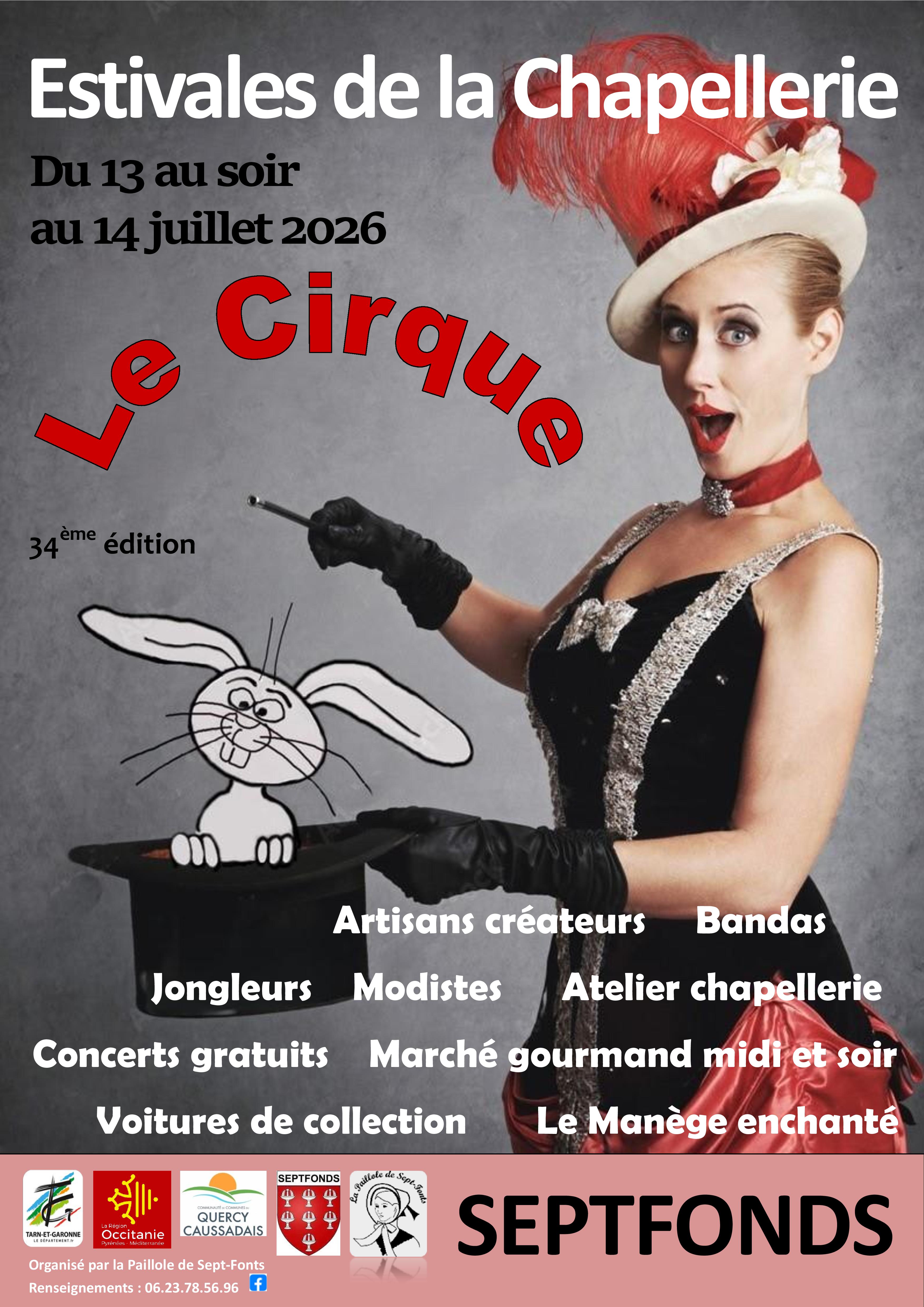 Ouverture du marché des artisans créateurs, modistes, accessoires et décoration, artisanat local avec tous les adhérents de la Paillole costumés sur le thème du cirque ; Marché gourmand, les vanniers du Dadou, La ferme de Plagnole, ses animaux vivants et son manège enchanté, exposition voitures de collection, atelier vivant de la chapellerie par la Paillole de Septfonds, jongleurs, clowns, bandas, surprises et facéties avec les Enjoliveurs.