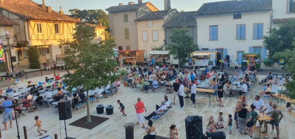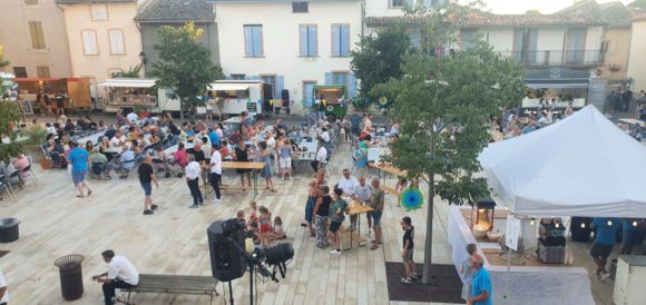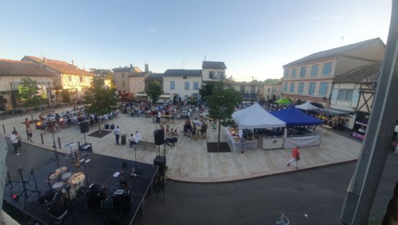 Manifestation festive et dégustation de produits locaux sur la Place Royale de Réalville, animée en musique.