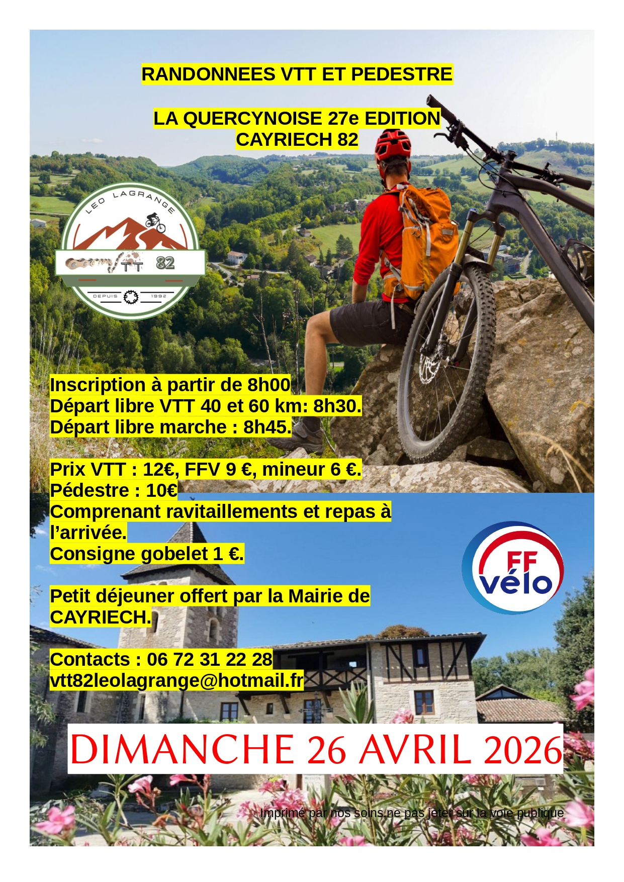 2 randonnées vtt (40 & 60 kms) & 1 randonnée pédestre 15 kms au départ de Cayriech, petit déjeuner au départ, ravitaillements sur le parcours & grillades à l’arrivée