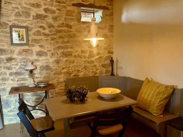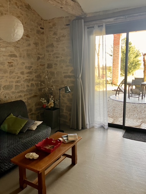 De larges portes s’ouvrent sur une terrasse extérieure couverte, idéale pour profiter du calme environnant. Le petit-déjeuner peut être pris à l’intérieur ou sur la terrasse. Une option de repas sur place est proposée, ou des conseils de restaurants à proximité sur demande.