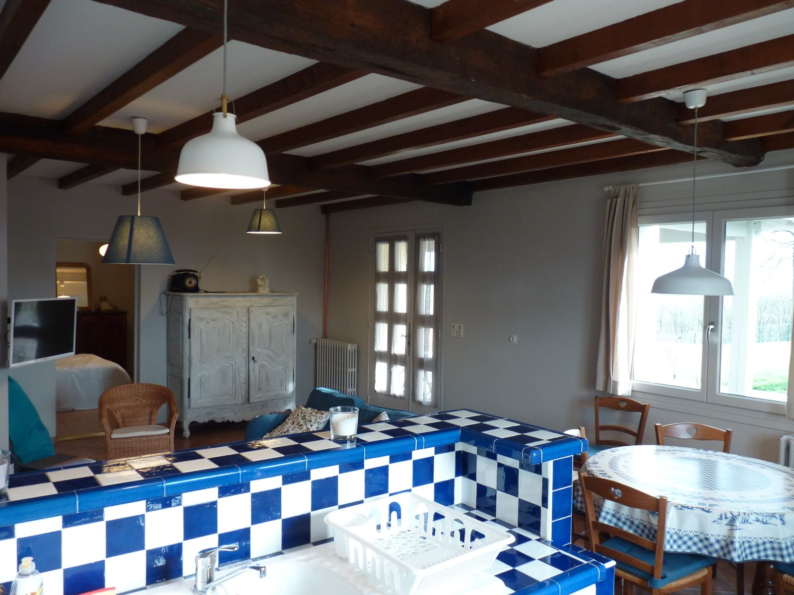 La cuisine est ouverte sur le salon dans une grande pièce avec cheminée (lave-vaisselle, lave-linge, micro-ondes, grille pain, bouilloire, four, plaques induction, hotte, réfrigérateur-congélateur).