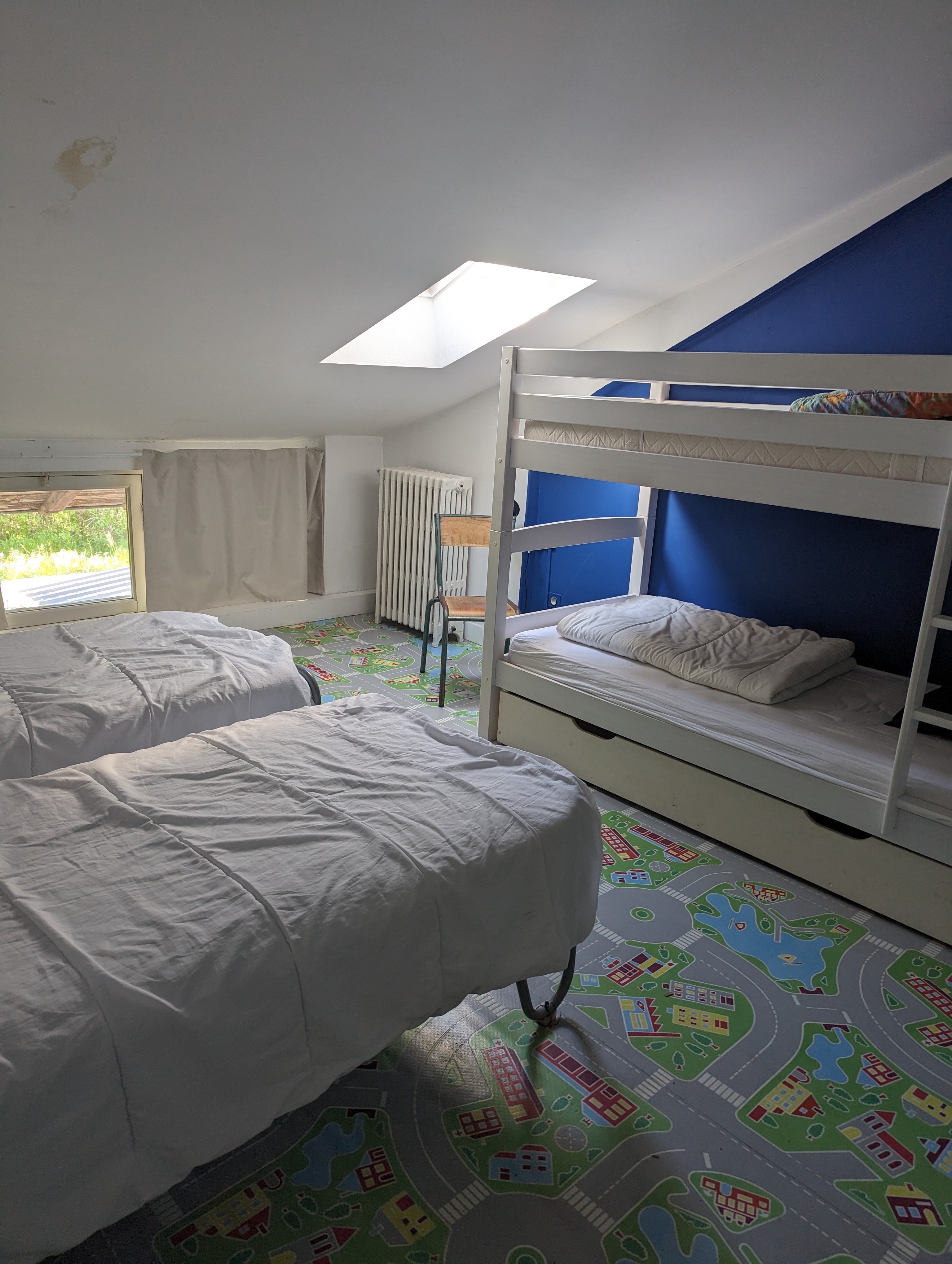1 chambre de 3 personnes et 2 chambres dortoir de quatre personnes décorées pour les enfants dans un style colonie de vacances. Cet espace nuit pour les enfants a été décoré dans cette thématique pour rappeler l’esprit colonie de vacances qui existait en ces lieux il y a quelques années. Au rez-de-chaussée, retrouvez les pièces de vie avec une cuisine équipée et une salle à manger ainsi qu’une terrasse. A l’étage, deux salons cosy viennent compléter l’espace nuit.