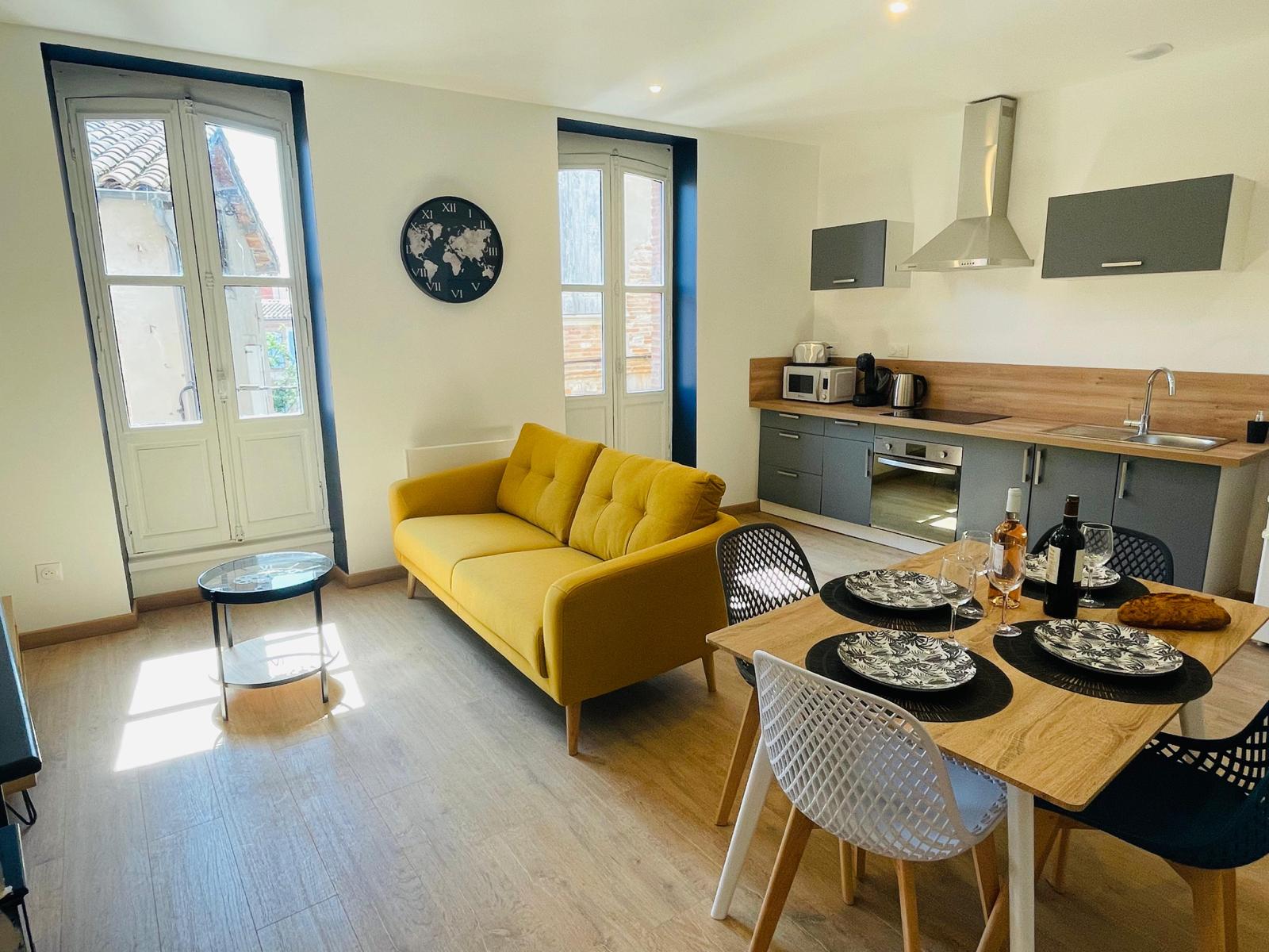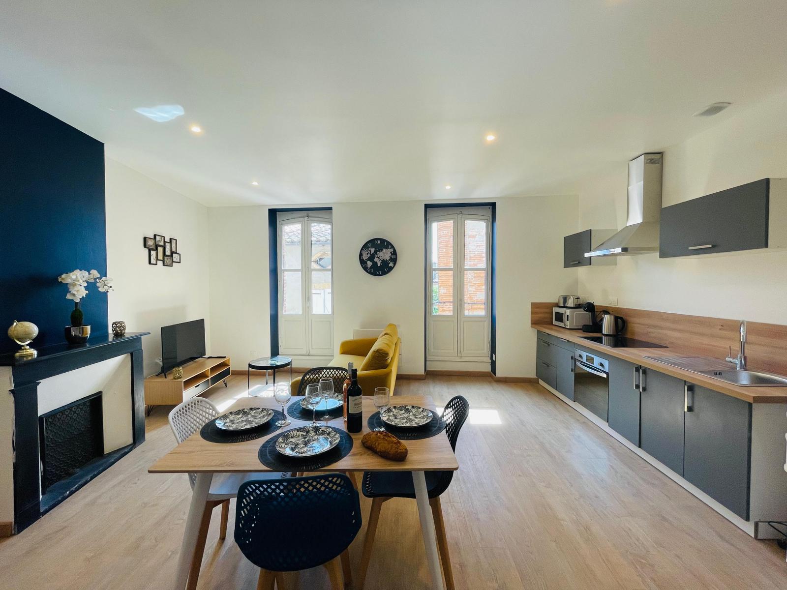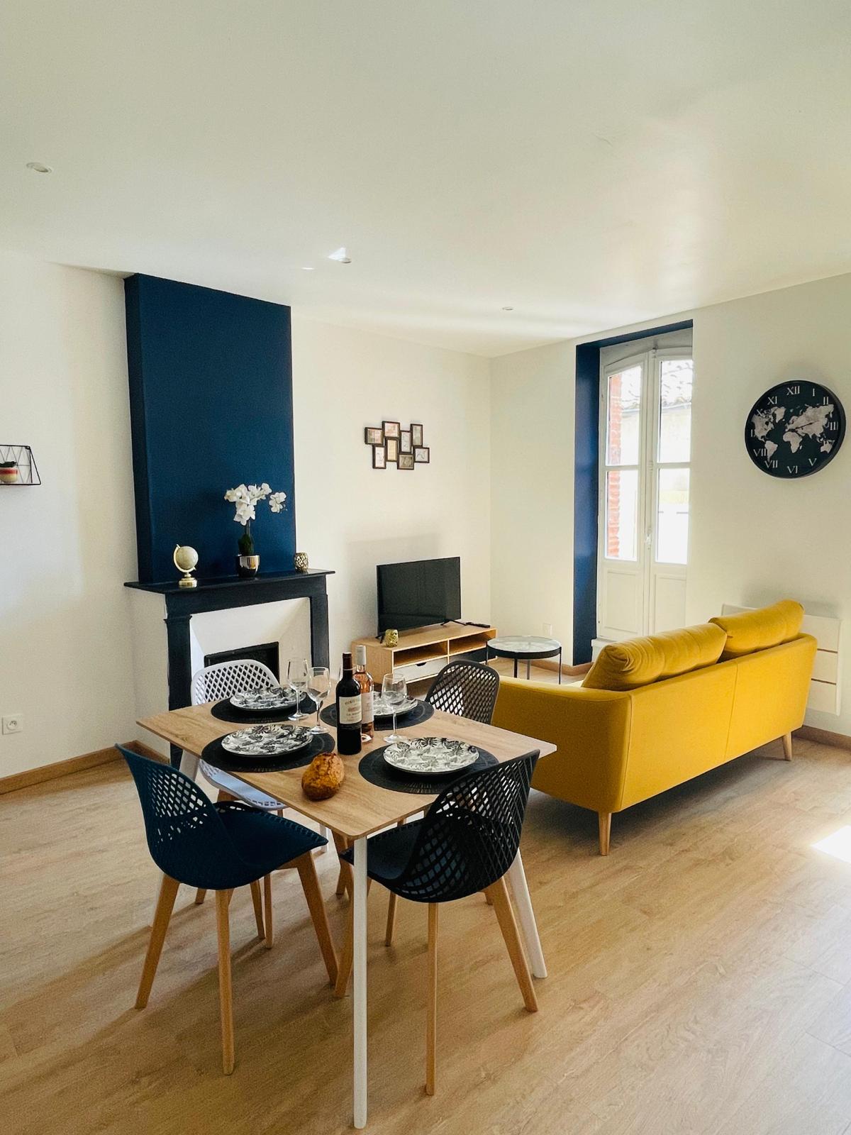Situé en plein centre-ville de Caussade, cet appartement duplex de 60 m², récemment rénové et décoré avec goût, vous accueille pour un séjour confortable et pratique. Installé au 2ᵉ étage, il peut recevoir jusqu’à 5 voyageurs grâce à ses deux chambres à l’étage.