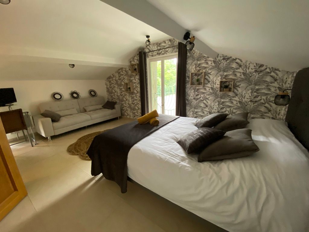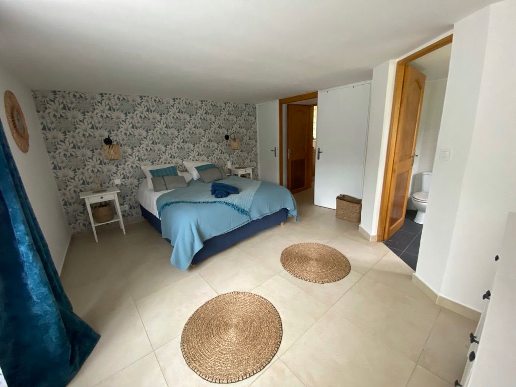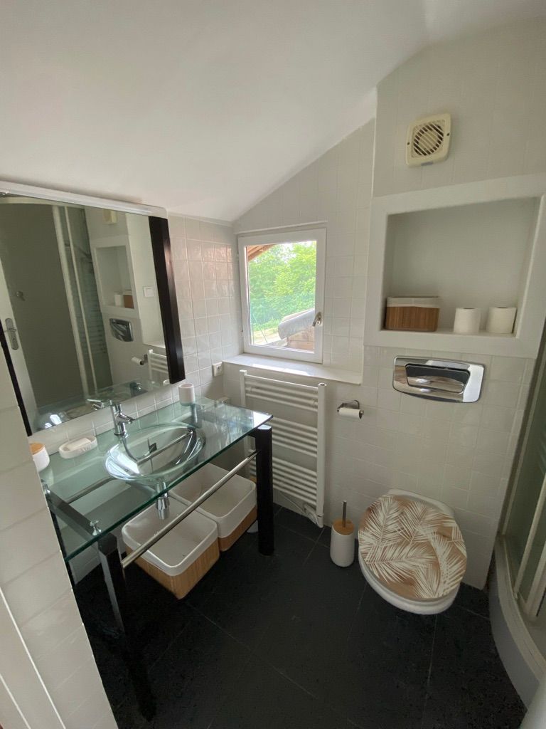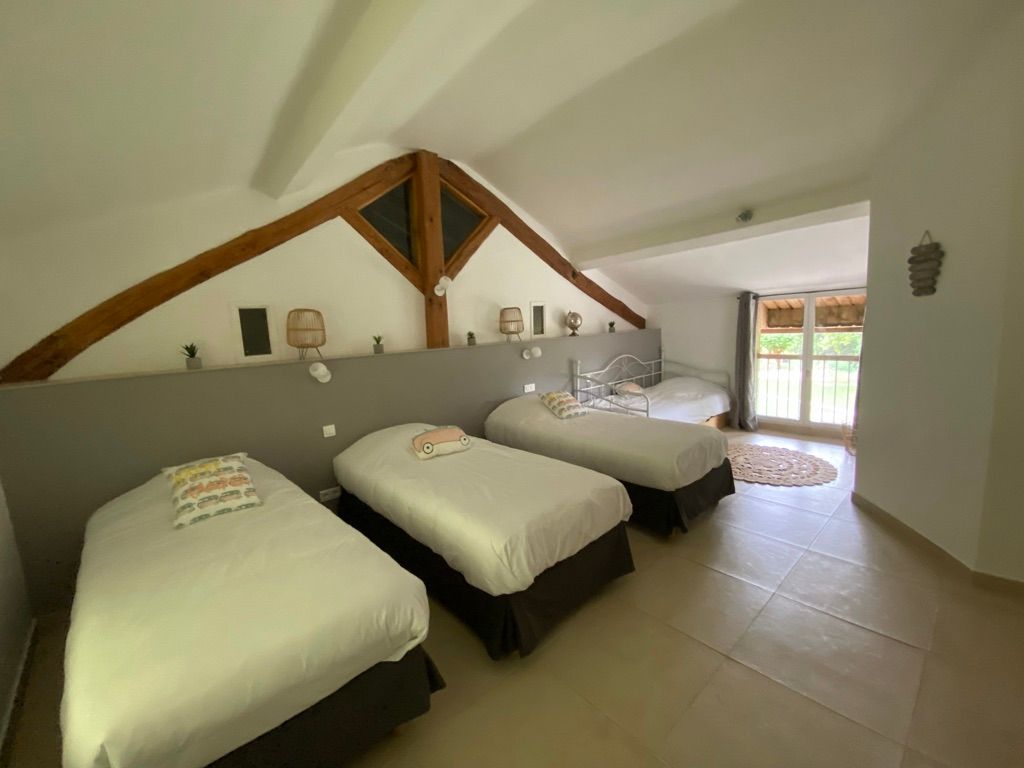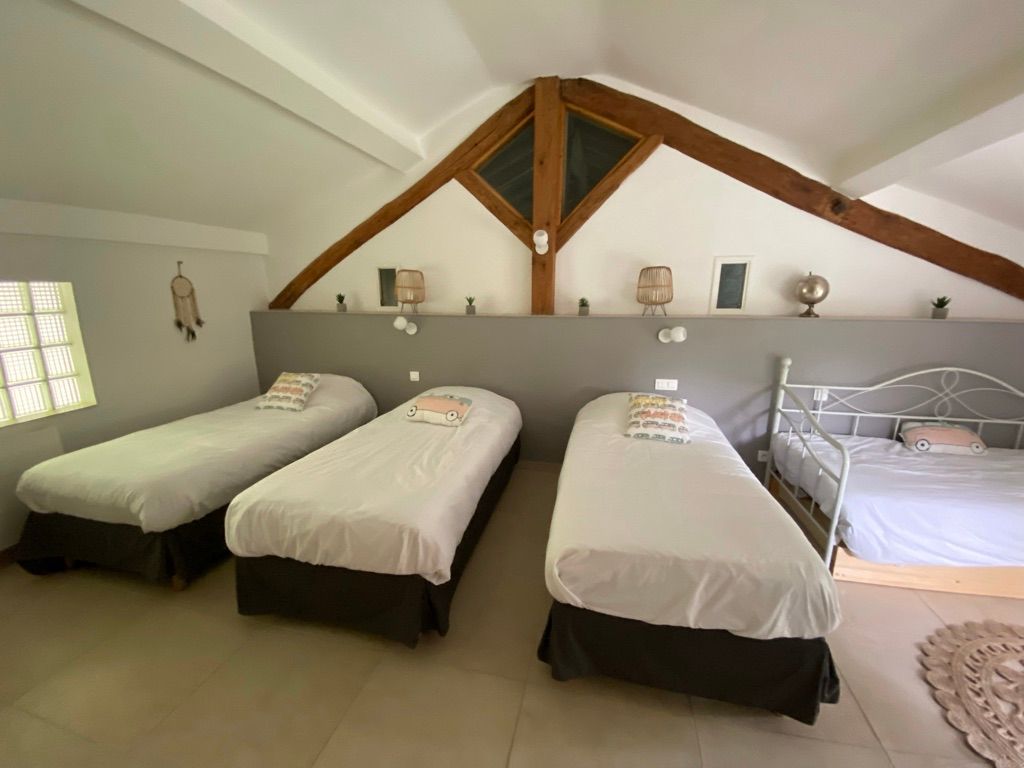 Le logement comprend au rez de chaussée un hall d’entrée desservant un séjour salon (canapé d’angle, fauteuils, table chaises, TV), une cuisine de type intégrée (réfrigérateur, congélateur, plaque, four micro-ondes). Une chambre (1 lit 160, salle d’eau et wc privatifs). A l’étage une chambre enfants de type grand dortoir (4 lits 0,90), salle d’eau et wc privatifs), et en passant par une coursive une autre chambre (1 lit 160, salle d’eau et wc privatifs). Terrasse avec salon de jardin, table et bancs, barbecue, plancha). LInge de lit et linge de toilette fournis compris dans le prix. lit parapluie chaise haute fournis si besoin. Wifi dans le logement gratuit. L’entrée à la base de loisirs comprise dans le tarif du séjour pour le nombre de personnes du gîte. Accès libre au tennis et au terrain de pétanque à côté du gîte.
