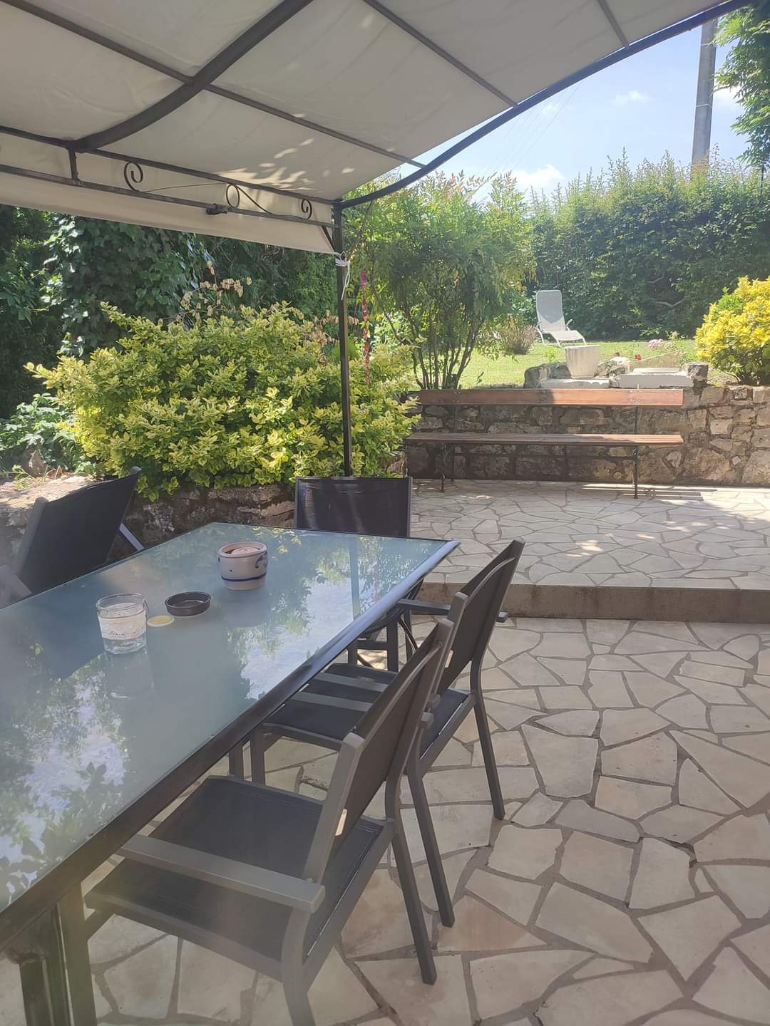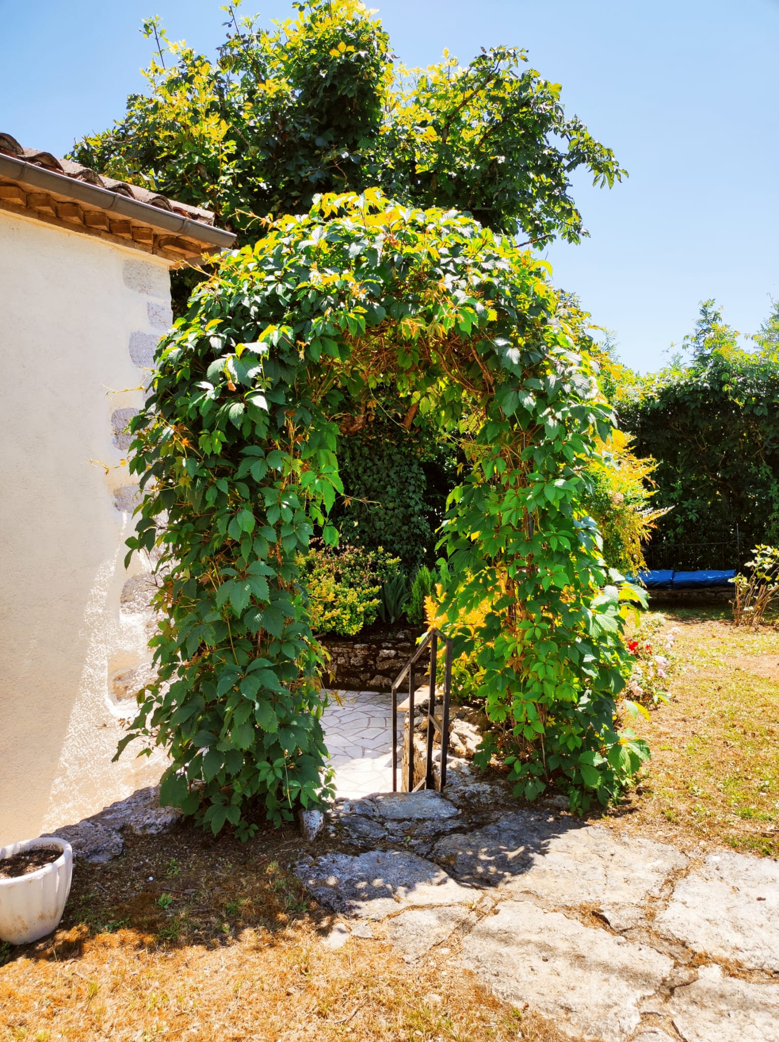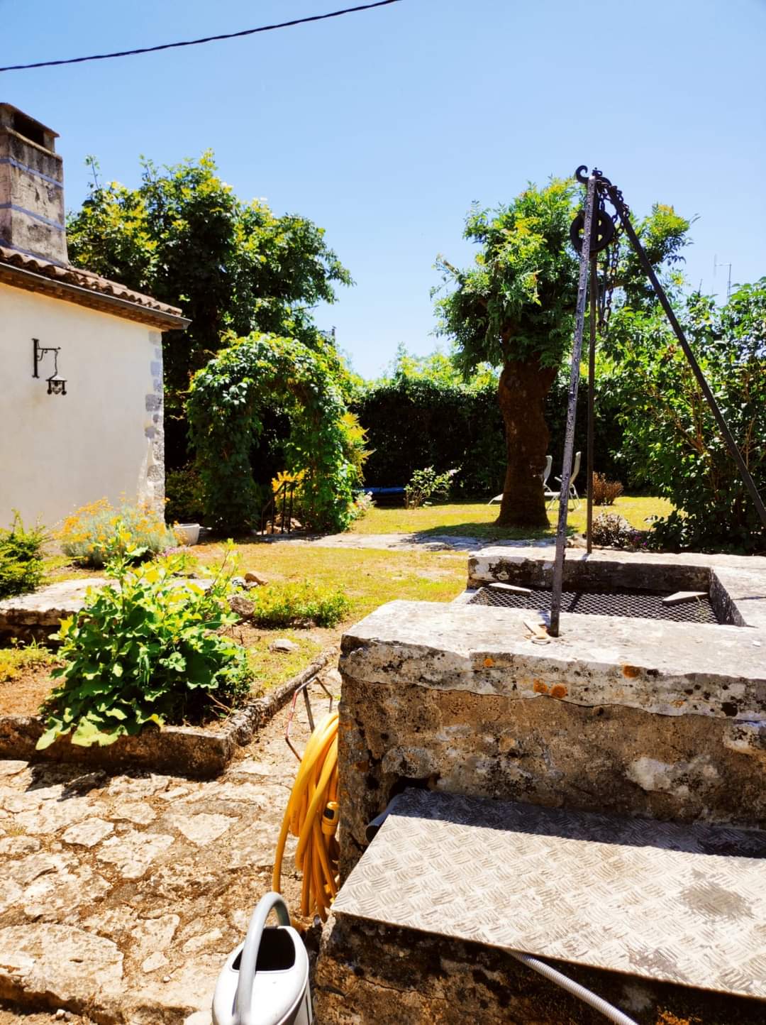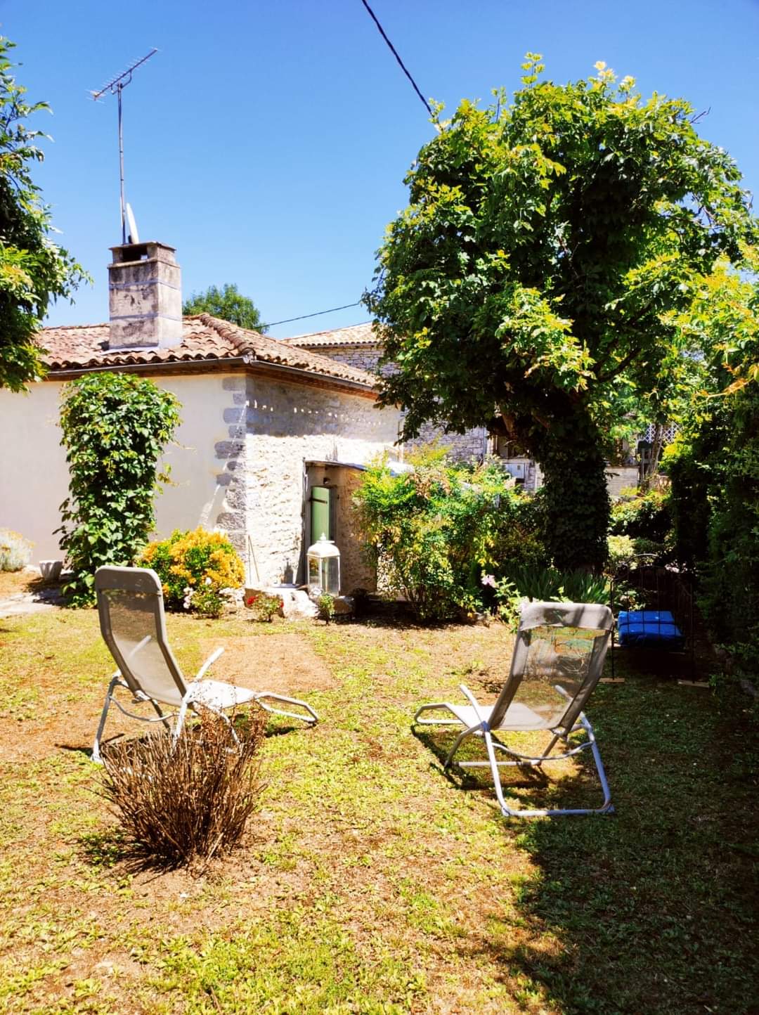 Maison en pierres de plain pied (3 marches pour accéder à la salle de bain et WC) avec jardin clôturé et terrasse.