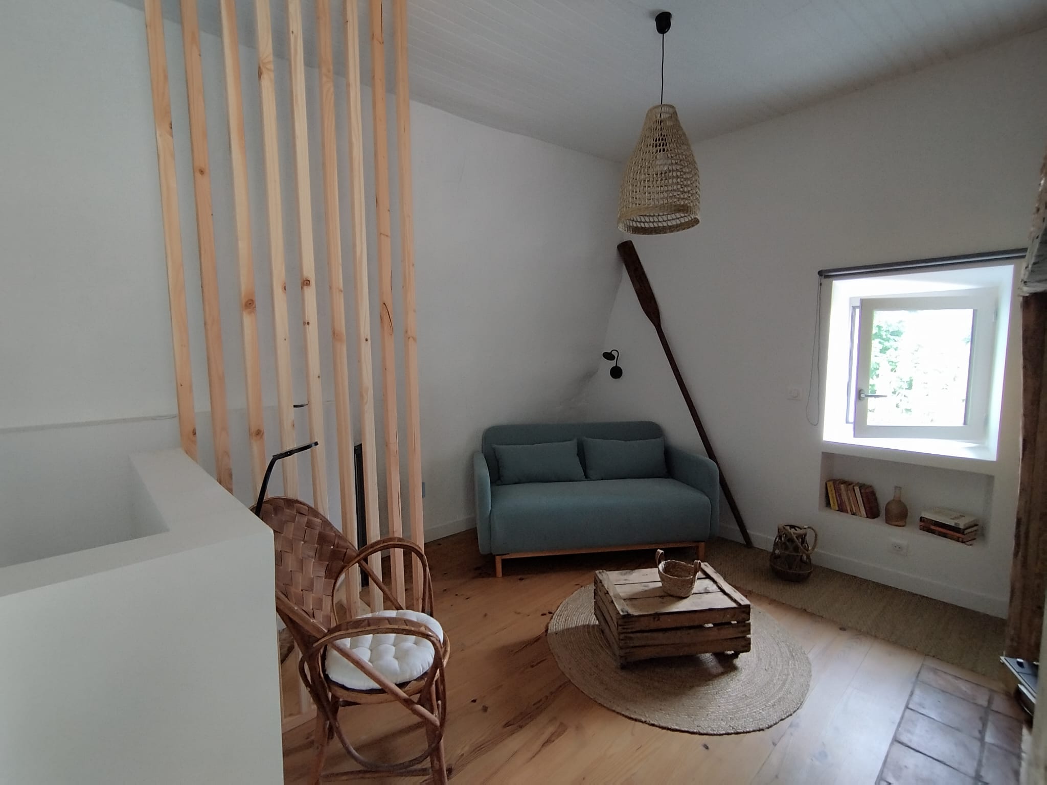 Maison de village pour 2 à 4 personnes avec, en rez-de-chaussée, un séjour et une cuisine équipée donnant sur une terrasse, et à l’étage, un salon avec canapé convertible (couchage 140), une chambre (couchage 160) er une salle d’eau avec WC