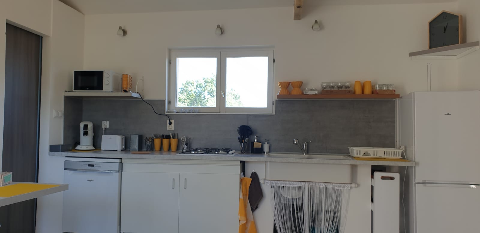 -une cuisine ouverte et aménagée (plaque gaz,lave vaisselle, frigo/congélateur, micro-ondes, senseo,grille pain,batterie complète de cuisine pour 4 personnes,lave linge en sus).