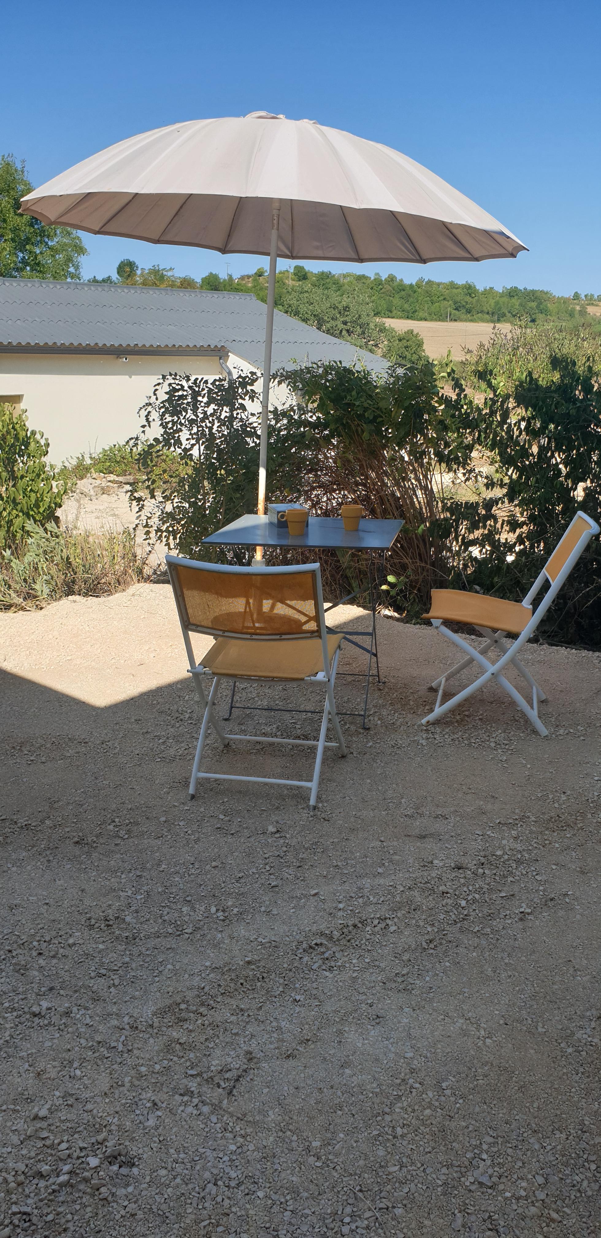 -Une terrasse stabilisée de 30m2 avec une table bistro,2 chaises et un parasol.