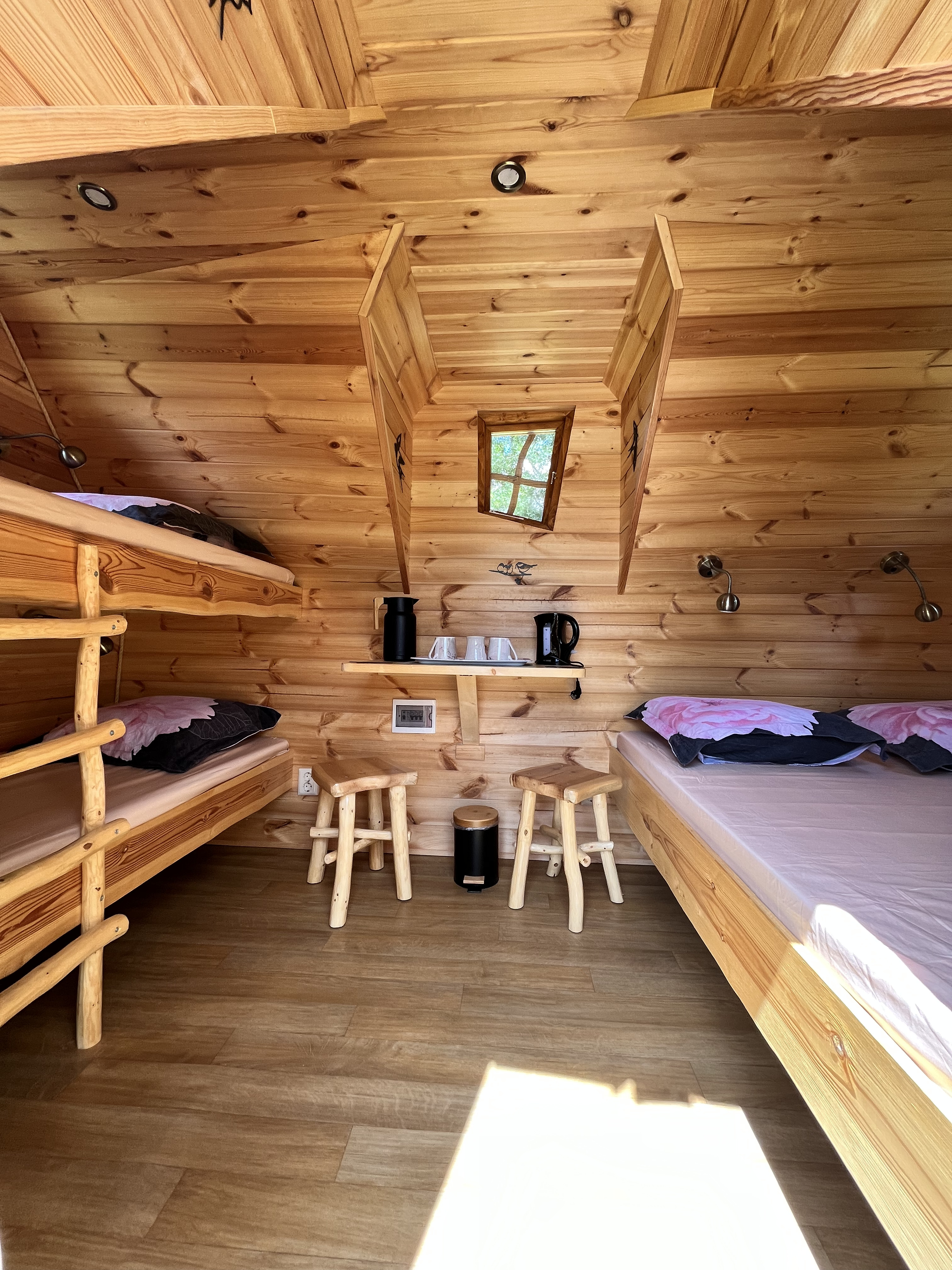Equipée de 4 couchages, isolée sans faire l’impasse sur le confort : plateau de courtoisie, bouilloire, chauffage, ventilateur, sanitaire à proximité (toilettes et douche à jet). Grand lit en 140. 2 lits superposés en 90.