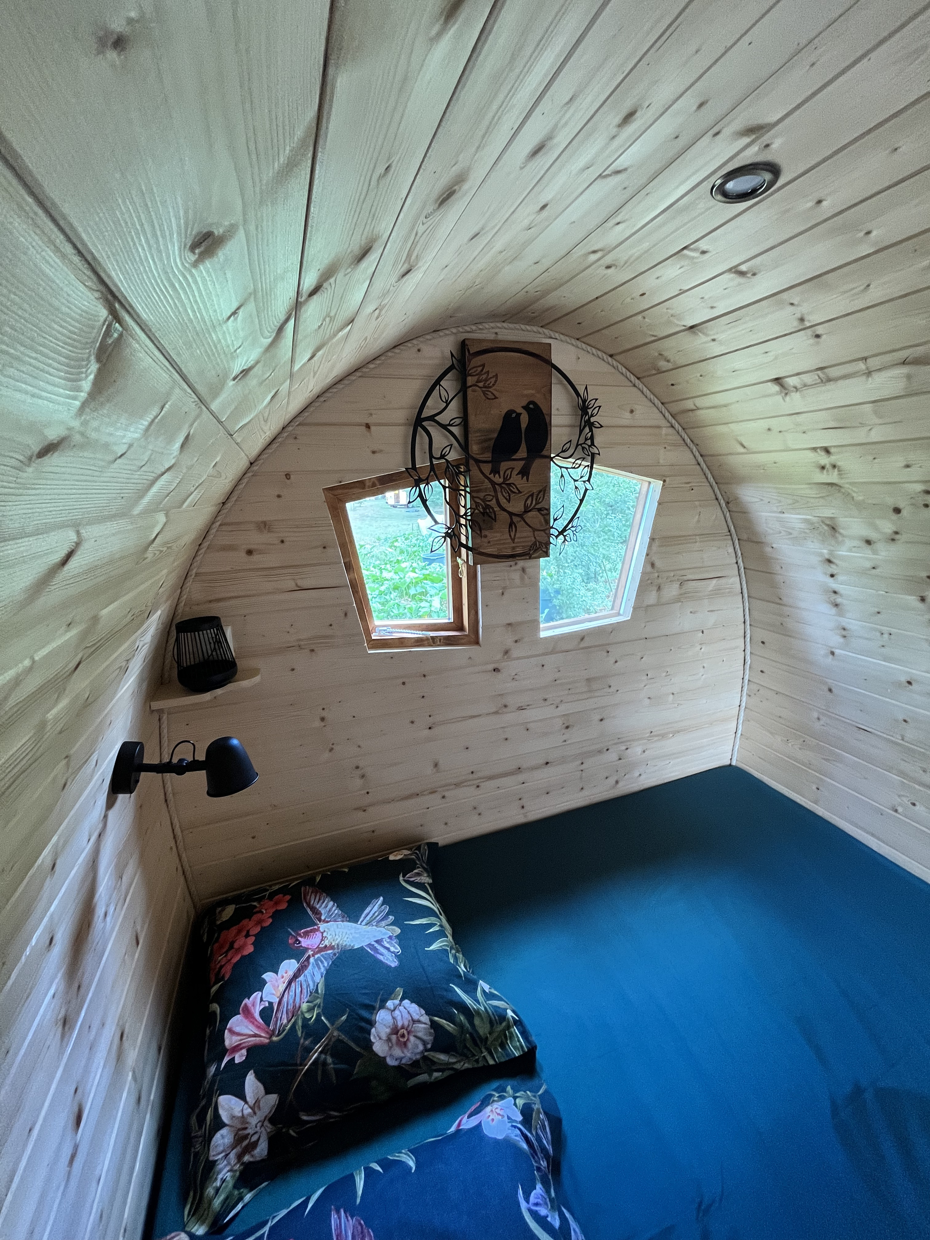 Isolée et équipée d’un grand lit, douche et WC privatifs, chauffage, ventilateur, plateau de courtoisie : cette petite cabane insolite pour 2 personnes ravivera le cœur des « hirondelles » !