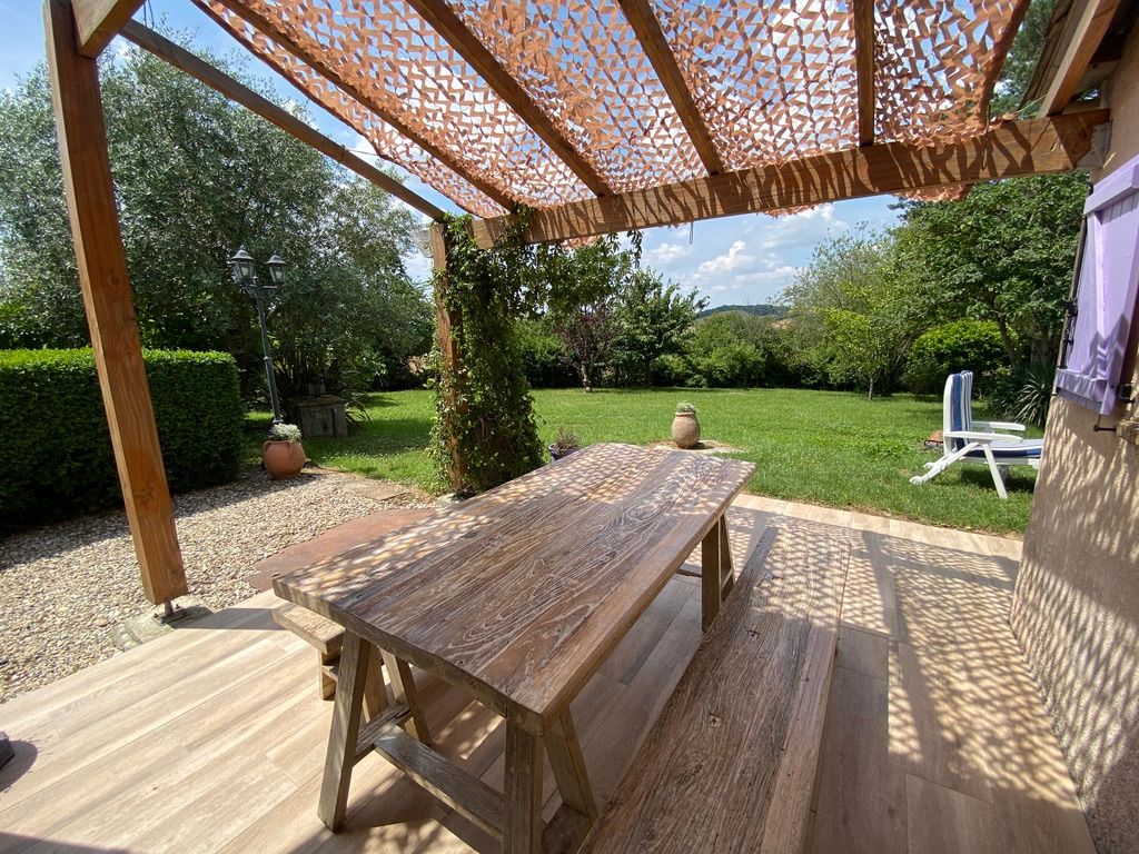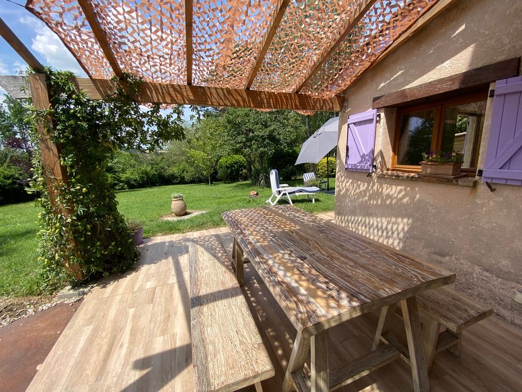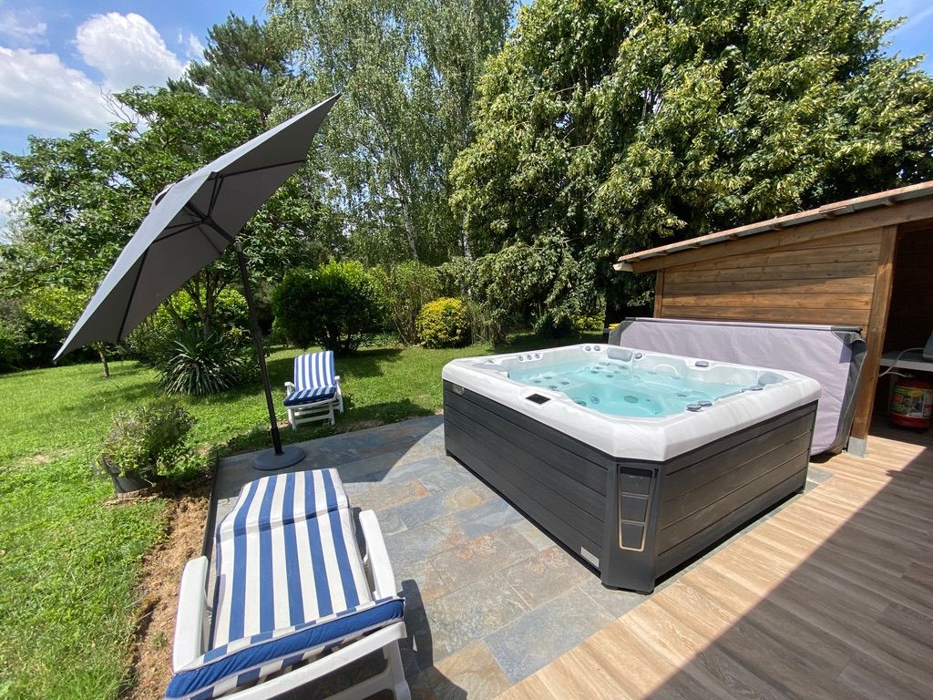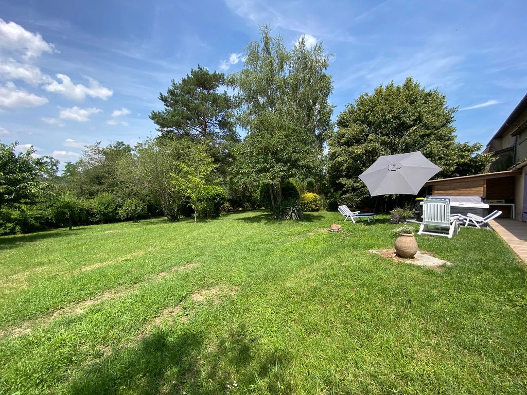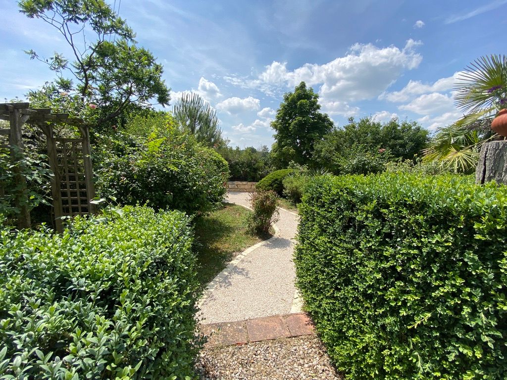 Imaginez-vous déambuler dans ce magnifique jardin de curé très arboré, où les buis marquent les allées, pour terminer sur l’arrière de la maison avec son spa.