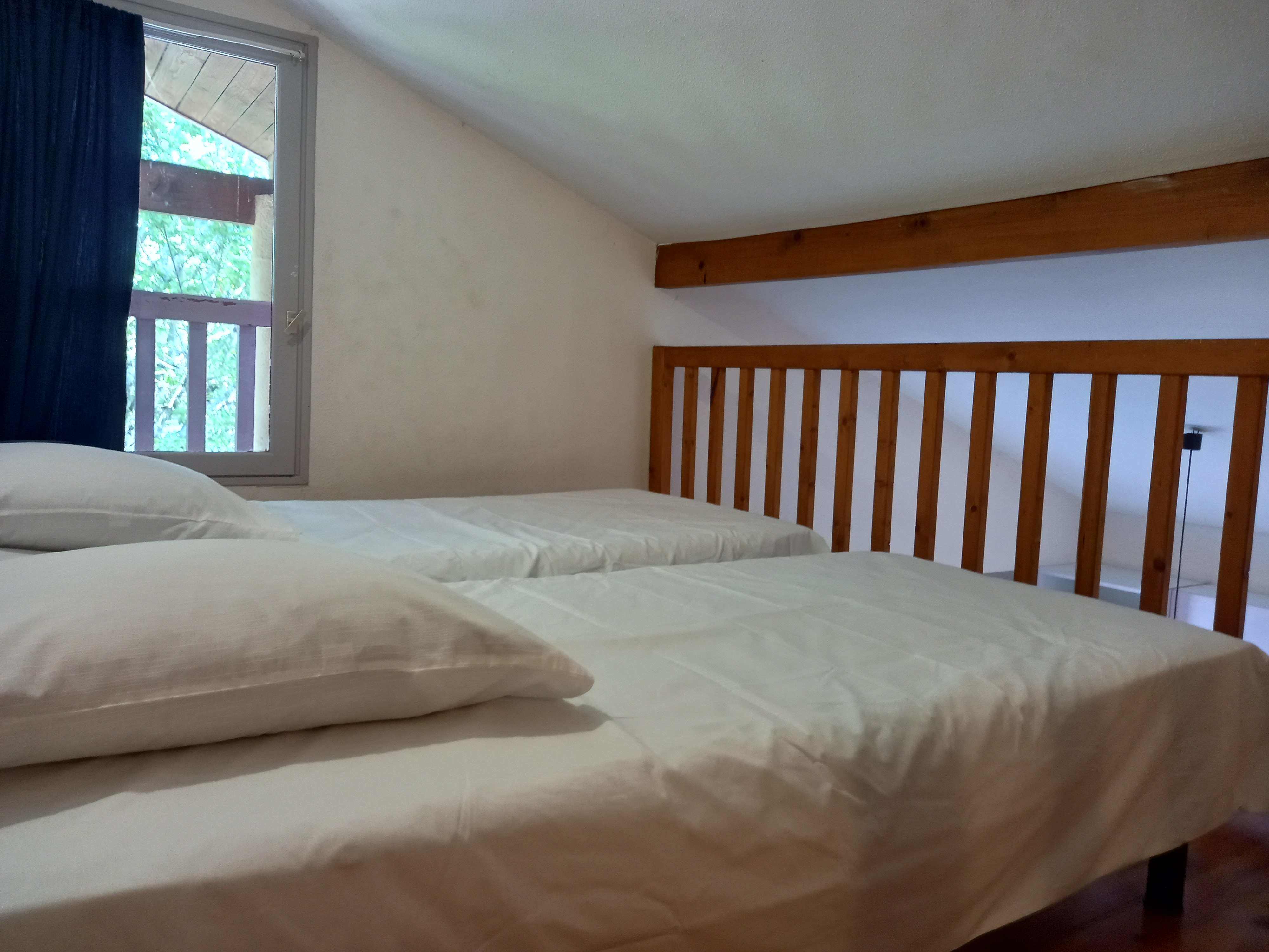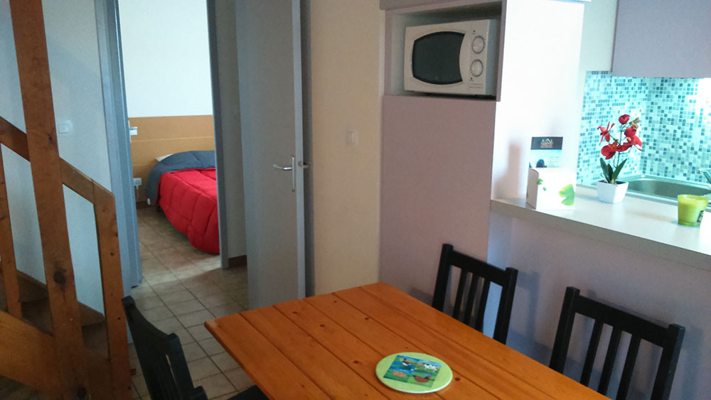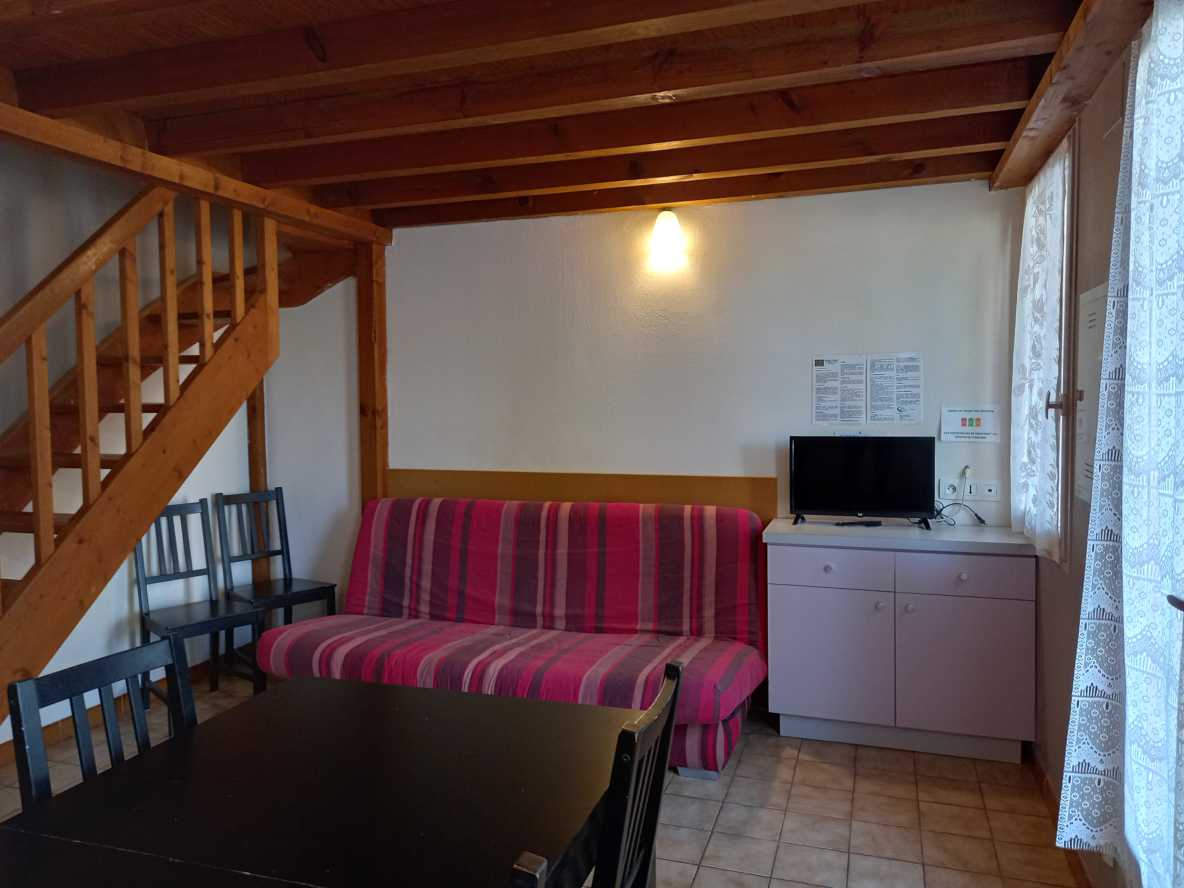 4 logements 6/8 places (43 m2) : au RDC : salon-coin cuisine avec TV et canapé-lit 2 pers., 2 chambres (1 grand lit, 2 lits 1 place), salle d’eau et WC indépendant. Une mezzanine ouverte au-dessus du salon avec 2 lits 1 personne. Téléphone à la demande.